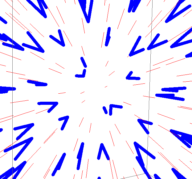 I’ve got a metric-ton of Mathematica I’ve written over the years for doing computational geometry and it stood me in good stead. The blue ‘V’s you see are mismatched surface normals – they should be coincident (e.g. exactly the same) but, as you can see, there is a systematic error. Fixed it.